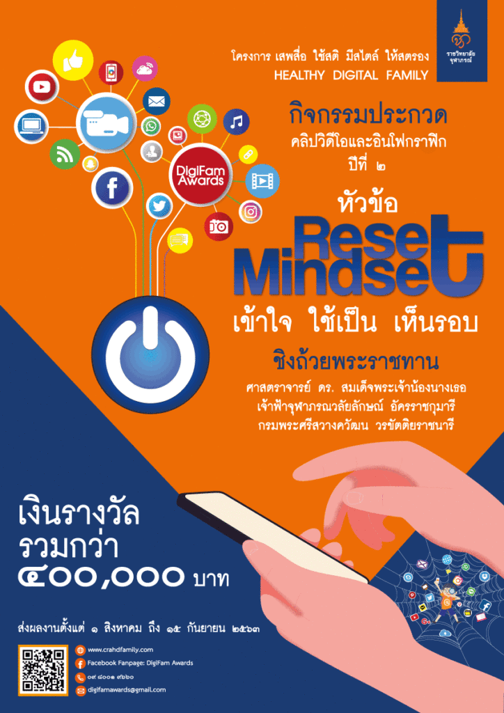 - เจ้าของผลงานที่เข้ารอบสุดท้ายจะต้องร่วมพิธีประกาศรางวัลการประกวดผลิตคลิปวิดีโอและอินโฟกราฟิก ภายใต้แนวคิด “Reset Mindset เข้าใจ ใช้เป็น เห็นรอบ” ในโครงการ Healthy Digital Family ผู้ชนะรางวัลจะได้รับรางวัลถ้วยพระราชทาน ศาสตราจารย์ดร.สมเด็จพระเจ้าน้องนางเธอ เจ้าฟ้าจุฬาภรณวลัยลักษณ์ อัครราชกุมารี กรมพระศรีสวางควัฒน วรขัตติยราชนารี และเงินรางวัลในแต่ละประเภท