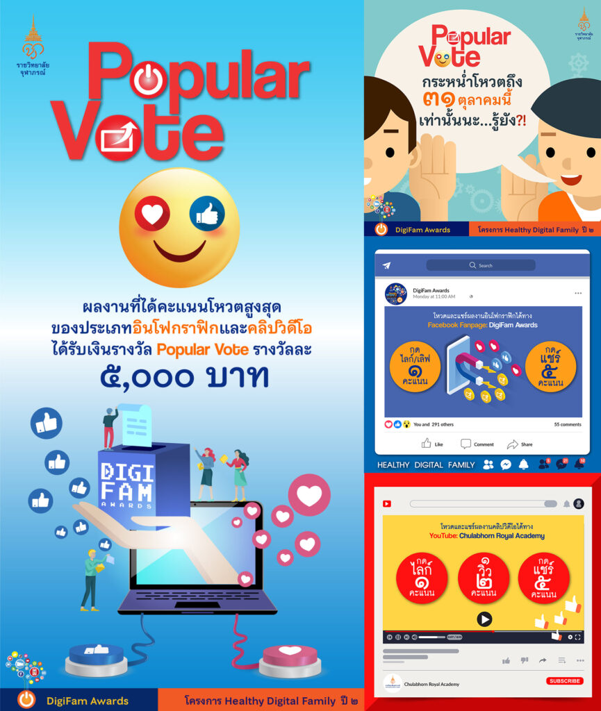 ราชวิทยาลัยจุฬาภรณ์จึงจัดการประกวดคลิปวิดีโอและอินโฟกราฟิก “DIGIFAM AWARDS ครั้งที่ ๒” ชิงถ้วยพระราชทาน ศาสตราจารย์ ดร. สมเด็จพระเจ้าน้องนางเธอ เจ้าฟ้าจุฬาภรณวลัยลักษณ์ อัครราชกุมารี กรมพระศรีสวางควัฒน วรขัตติยราชนารี และเงินรางวัลมูลค่ารวมกว่า ๔๐๐,๐๐๐ บาท ซึ่งเป็นกิจกรรมใน โครงการ Healthy Digital Family “เสพสื่อ ใช้สติ มีสไตล์ ให้สตรอง” โดยเปิดโอกาสให้นักเรียน นักศึกษา และประชาชนทั่วไปร่วมส่งผลงานการผลิตสื่อคลิปวิดีโอและอินโฟกราฟิก แสดงแนวคิดในการใช้สื่ออย่างสร้างสรรค์ปลอดภัยและมีวัฒนธรรม